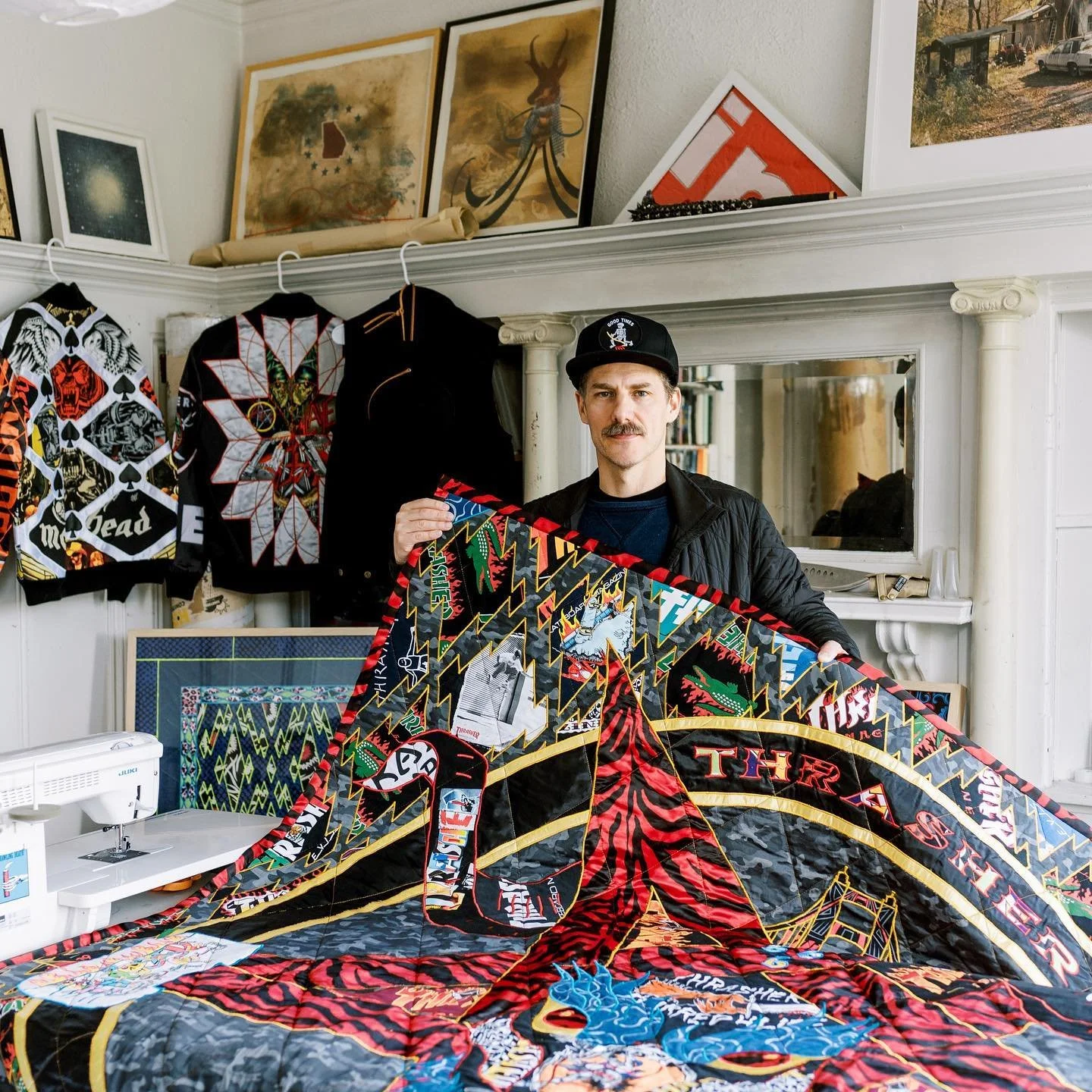 Ben fuses rock-and-roll aesthetics with quilting, transforming salvaged denim, band T-shirts, and bandanas into striking textile art — including our 30’ x 15’ custom stage curtain, crafted over two months from repurposed fabrics.