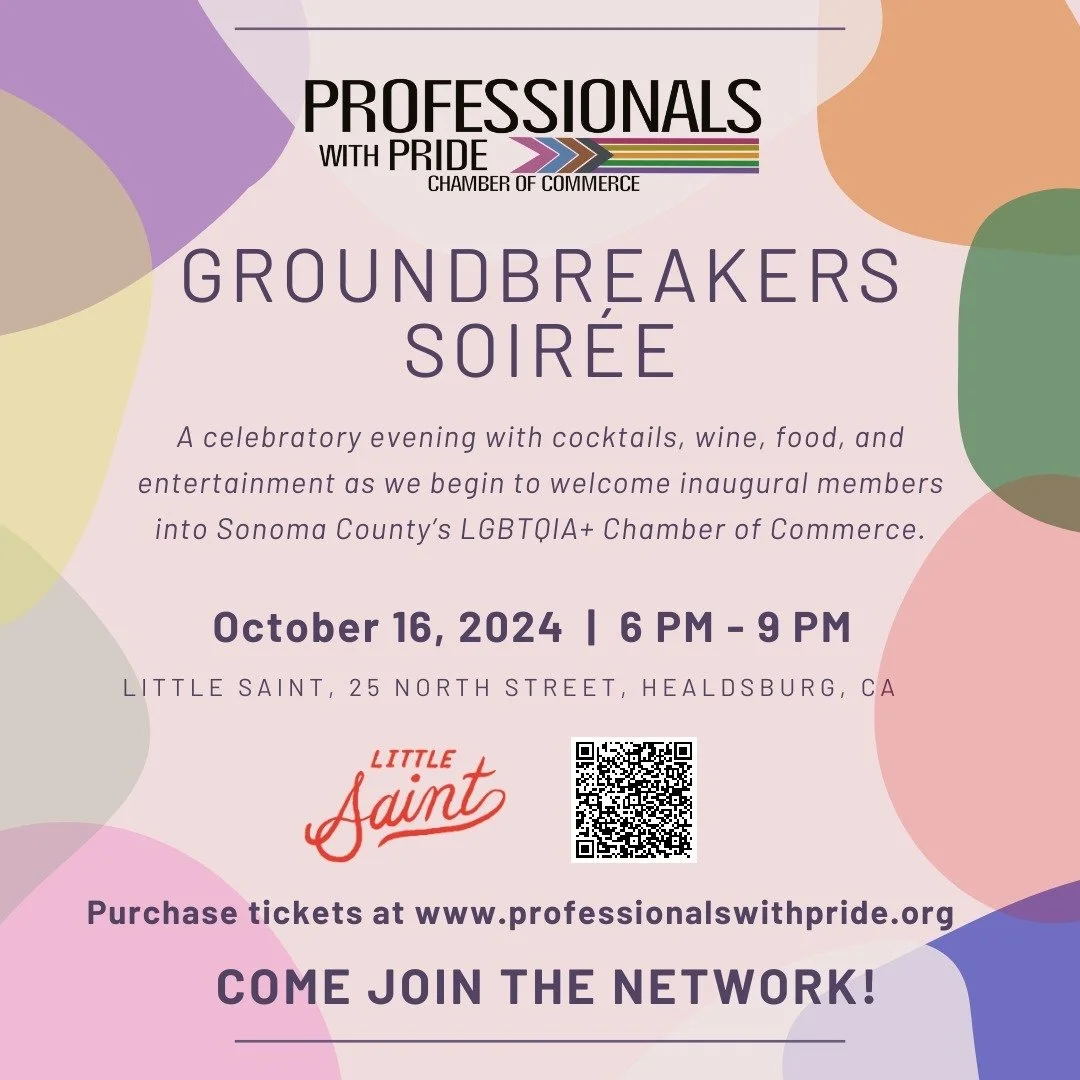 We're thrilled to host the debut event of Sonoma County's LGBTQIA+ Chamber of Commerce! Join Professionals with Pride on October 16, 2024, from 6-9 PM for an evening of celebration, cocktails, wine, great food, and entertainment.