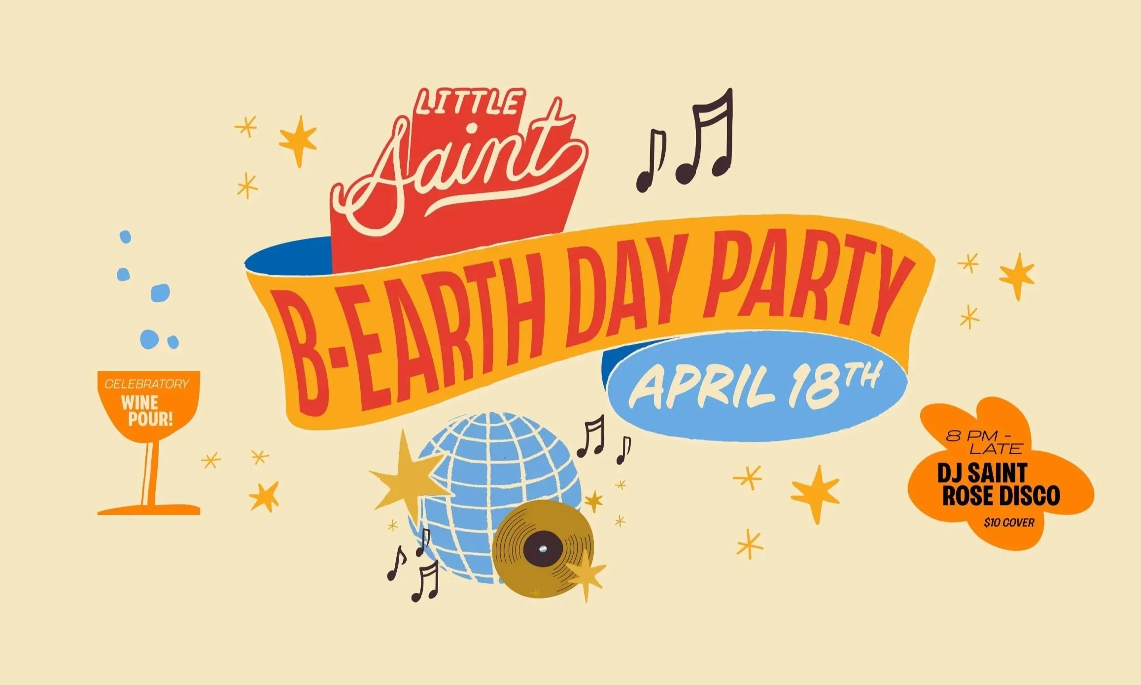 Since opening on Earth Day 2022, we’ve been celebrating our B-Earth Day—come join the party. DJ Saint Rose Disco will bring the dance floor to life + you’ll be welcomed with a complimentary pour to start the night. We want to sip, dance, and celebrate with you over great wine and cocktails.